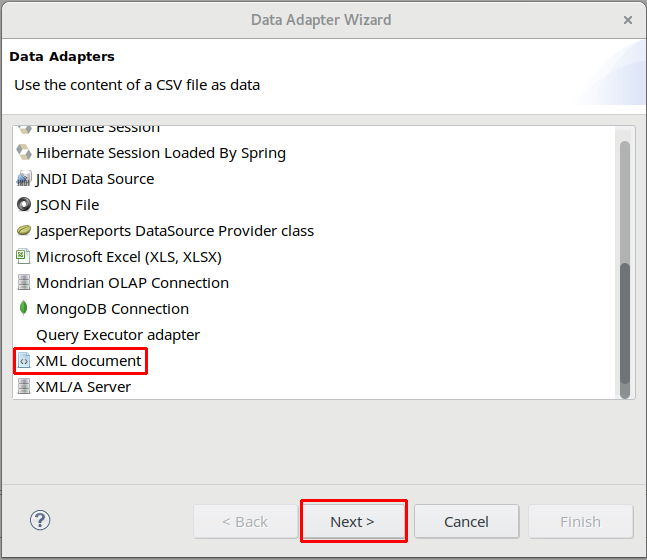6) Iremos agora selecionar como fonte de dados a opção XML Document, e após selecionar esta opção, clique em Next.